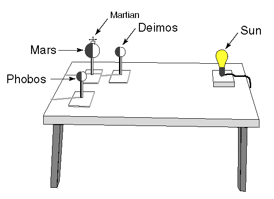 The set up on the table is a model of the Sun, Mars, and Mars' two moons, Deimos and Phobos. Deimos and Phobos have phases just like our Moon has phases. Please look at the model and determine the phase of each moon as seen by the martian.