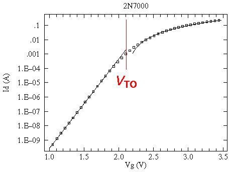 The defining parameter -- the transconductance g or yfs -- is not at all constant. To the extent that the drain current depends quadratically on the gate voltage, the transconductance -- which is the derivative: dID/dVG -- depends linearly on VG above threshold. Below is the measured relationship: ID vs VG for the above 2N7000. Notice that for VG>VTO, the drain current is well approximated by the quadratic, whereas for VG<VTO (i.e., sub-threshold) the drain current depends approximately exponentially on VG. Thus the drain current is not strictly zero below threshold, merely exponentially small.