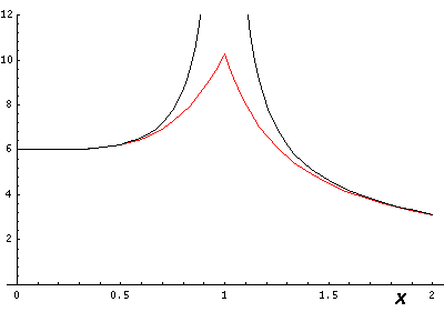 If we look (in the x-y plane) along the line x=y (and z=0) we can see a noticeable deviation between approximate (red) and exact (black) and a jump at r=1 in the approximate where we switch between formulas: