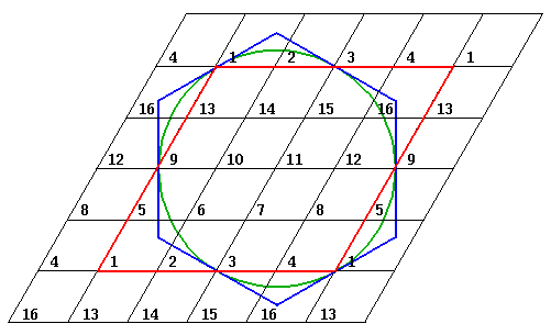 This problem lacks an algebraic answer...we hare going to have to solve this equation by computer approximation. We begin by griding: breaking up our unit cell into smaller pieces. We hope that the value of the wavefunction at these grid points will well-represent the wavefunction even between the grid points. I've included in the below diagram our red rhombus which we use to tile real space. The centered circle of attraction is shown in green. In case you wondered what a honey-comb of hexagons would look like instead of the tiling of rhombuses, I've included a centered blue hexagon.