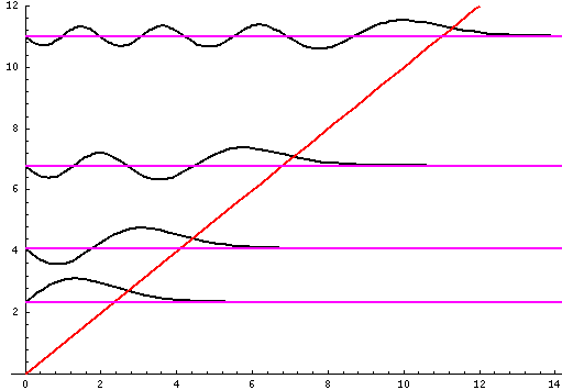 Let me take a second to explain this "stacked probability density" display. We are interested in displaying where the particle is likely to be found for several different possible energies. We can display (as I did directly above) individual probability densities on individual plots, but lots of such plots are deemed a waste of space, so we aim to plot several functions on one graph. Imagine what would happen if we try to use the same axes and overplot the above two functions! Thus different functions are moved vertically up to avoid overlapping display. The convention is to move each plot up a distance corresponding to that solution's energy. (Since solutions rarely have the same energy, we're automatically saved from overlapping plots.) Thus the zero line for each probability density function becomes the line of constant energy. This is potentially quite confusing because the y-axis is being used for two different things with different units and zero points. If we further confuse things by in addition to all of the above plotting the potential energy U(z'), we can see the separation of z' into classically allowed regions (where the probability oscillates) and classically disallowed regions (in which the probability grows small). The intersection of the constant energy lines with the curve of potential energy, shows the turning points (which bound the classically allowed regions).