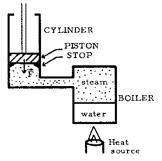 The above figure is a schematic of a primitive form of steam engine, the Newcomen engine. [You may be interested to know that this engine once represented the vanguard of technology, and it was used for some time to pump water out of the mines of England, in spite of its shocking inefficiency (by today's standards). Its success and its defects provided the stimulus for James Watt to invent a more efficient steam engine.] The operation of this engine can be idealized as follows.
