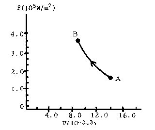 Process 1: The cylinder is removed from the ice-water bath, surrounded with an insulating jacket, and the piston is gradually pushed in. In other words, the gas is compressed adiabatically. The final state of the gas is now State B (see pV graph) with pressure pB = 3.6 x 105 Pa and volume VB = 8.3 x 10-3 m3. During this process the gas has done work W1.