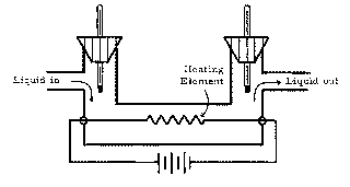 A liquid of density 1200 kg/m3 flows through at the rate of 1.20 x 10-5 m3/s. The heating element supplies 400 W, and, after steady state is achieved, it is observed that the liquid flowing out is 20.0° warmer than the liquid entering. (a) Assume that no heat is lost to the environment, and consider the mass of liquid flowing through the system in t seconds to be the system. Set up an equation for Q1 (the amount of heat gained by this system in time t) in terms of M (the mass of liquid flowing through in time t), c (the specific heat of the liquid), and T (the temperature change of the liquid). (b) Find Q2, the amount of heat lost by the heating element in t seconds. (c) Using the results of (a) and (b), set up the Q1 + Q2 = 0 equation, solve for the specific heat capacity, and evaluate the resulting expression.