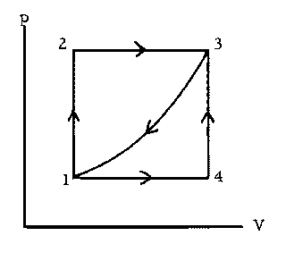 Stage 1: Isochoric heating--heat Q1 flows into the boiler and changes some of the water to steam, gradually increasing the gauge pressure on the bottom of the piston from 0 to p1. (The piston is initially held against the stops by a constant force F, resulting from the weight of the piston and the atmospheric pressure on the top of the piston.)