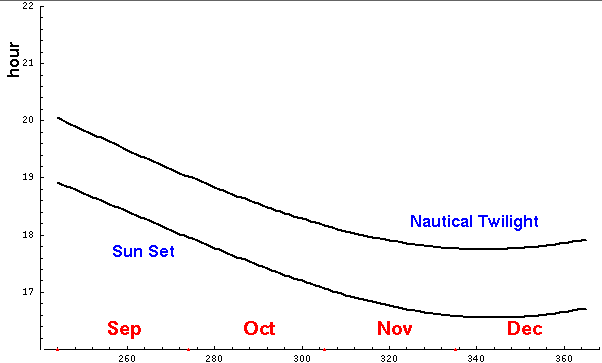 is defined to end in the evening, when the center of the sun is geometrically 12° below the horizon. At end of nautical twilight, under good atmospheric conditions and in the absence of other illumination, general outlines of ground objects may be distinguishable, but detailed outdoor operations are not possible, and the horizon is indistinct.
