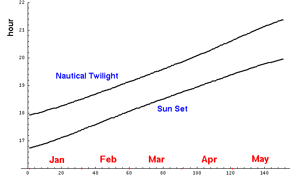The below form is designed to compute a table (valid for St. Joseph) for a year you select. The calculations are performed by the U.S. Naval Observatory!