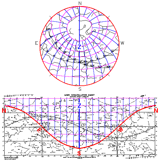 The blue lines are the hour circles; one for each hour of RA. The purple lines are the diurnal circles out to dec=+60° (in steps of 15°). Note the "hole" in the sky map near the NCP (i.e., decs beyond +60°). These are not included on the SC001. Note that half of the SC001 stars are not above the horizon at the time displayed (about 8 pm on November 20). Some of the SC001 stars (those with decs more negative than -45°) are never in our Minnesota sky.