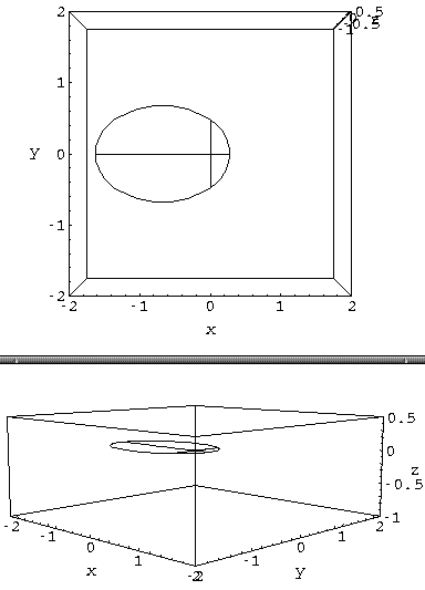 In this snapshot, the top frame shows the view looking down the z-axis and the bottom frame shows the view from a point a bit above the y=-x line. The major axis lies along the x-axis, the orbital plane is the x-y plane, and the angular momentum is along the +z axis.