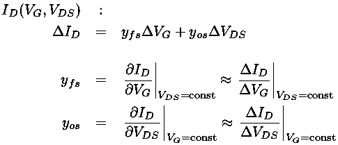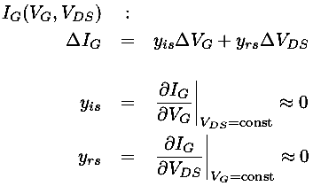 Clearly these admittance (y) parameters are not constants. For example yos is the slope of a characteristic curve, which is small for voltages near threshold and increases for larger VG.