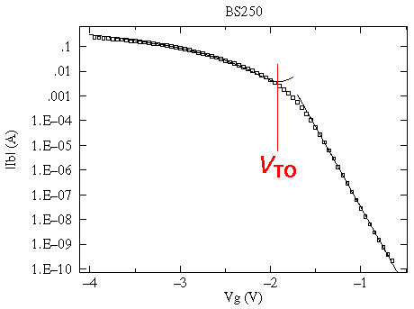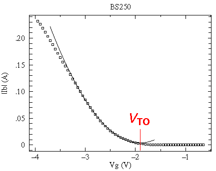The defining parameter -- the transconductance g or yfs -- is not at all constant. To the extent that the drain current depends quadratically on the gate voltage, the transconductance -- which is the derivative: dID/dVG -- depends linearly on VG. Below is the measured relationship: ID vs VG for the above BS250. Notice that for VG<VTO, the drain current is crudely approximated by the quadratic, whereas for VG>VTO the drain current depends approximately exponentially on VG. Thus the drain current is not strictly zero here, merely exponentially small.