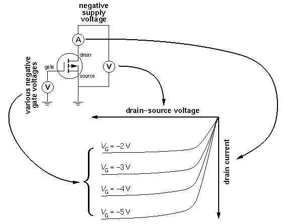 The behavior of an enhancement p-channel metal-oxide field-effect transistor (pMOSFET) is largely controlled by the voltage at the gate (usually a negative voltage). For the usual drain-source voltage drops (i.e., the saturation region: negative voltages from a few volts down to some breakdown voltage) the drain current (ID) is nearly independent of the drain-source voltage (VDS), and instead depends on the gate voltage (VG). (This is unusual behavior: usually more voltage produces to more current, but here the current only increases slightly with increasing VDS.) The transconductance, i.e., the ratio of the change in drain current to change in gate voltage, often denoted by g or yfs, is